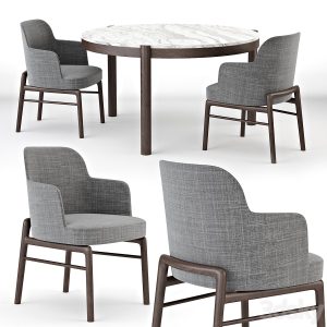 آبجکت معماری ست میز و صندلی با روکش پارچه و پایه های چوبی همراه با میز گرد