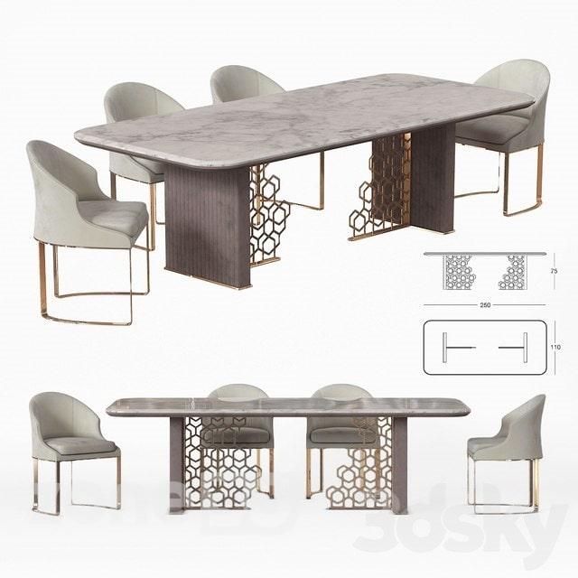 آبجکت معماری ست میز و صندلی چهار نفره با روکش پارچه و پایه های فلز همراه با میز رویه سنگی