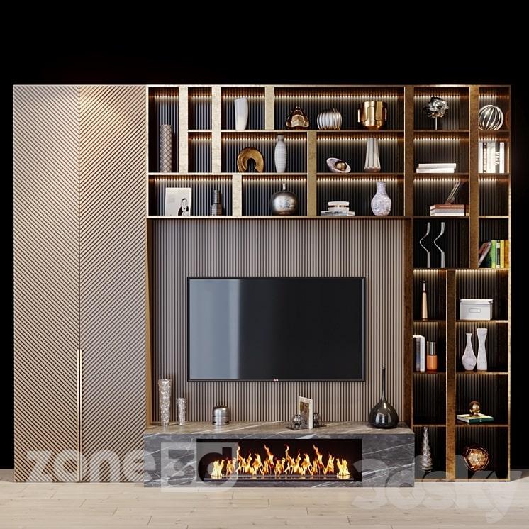 آبجکت معماری دیوار پشت تلویزیون به همراه شلف و اکسسوری